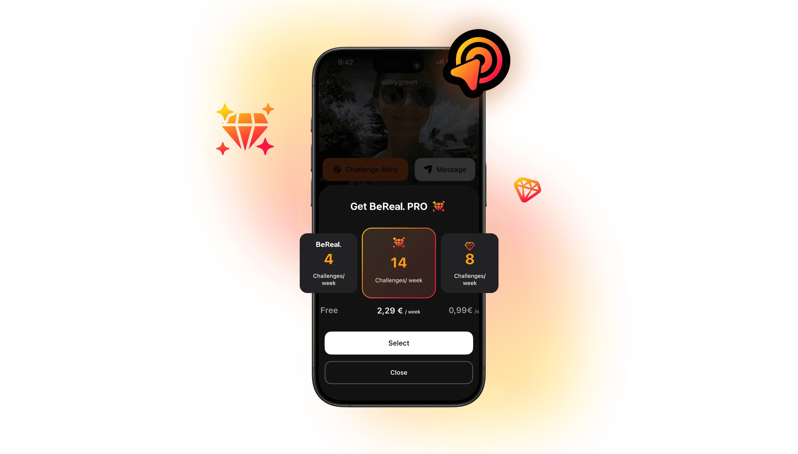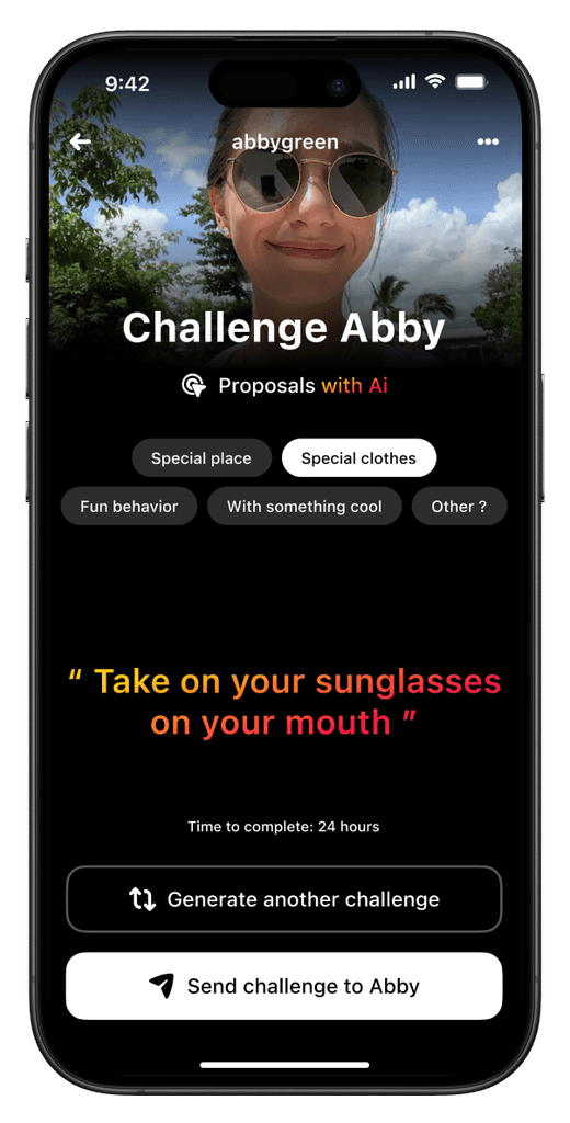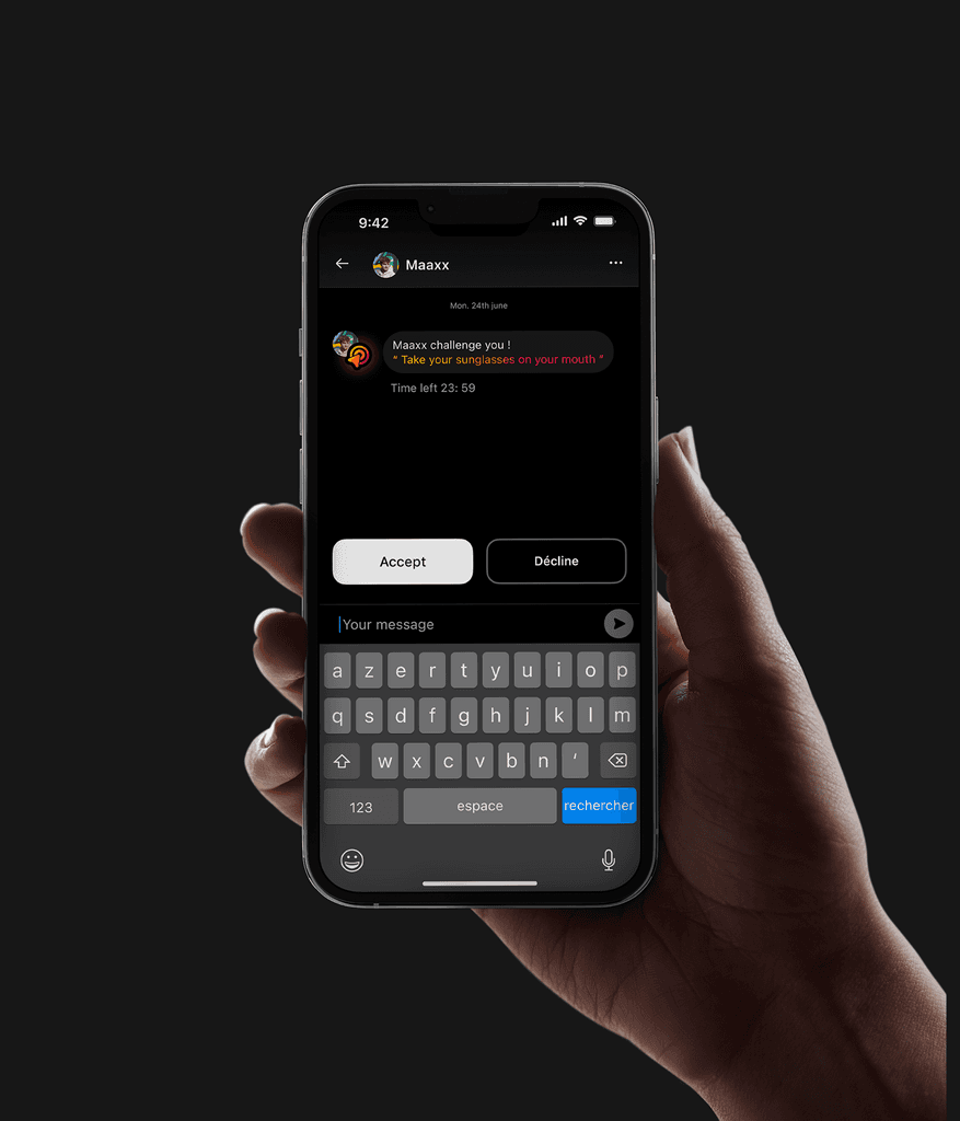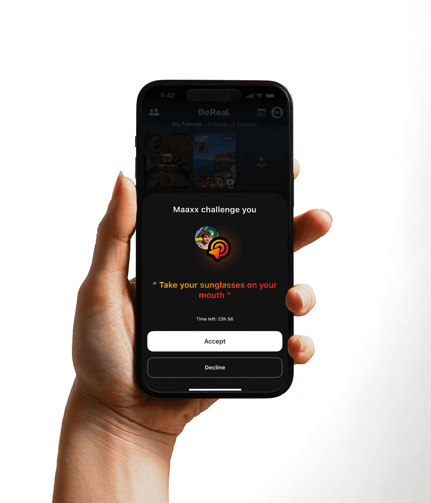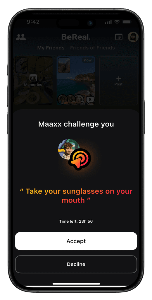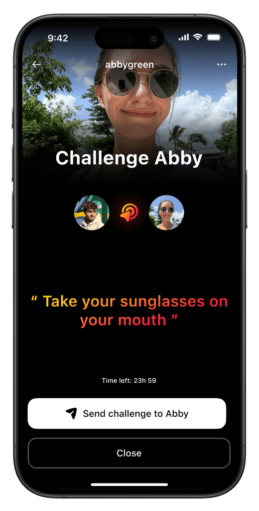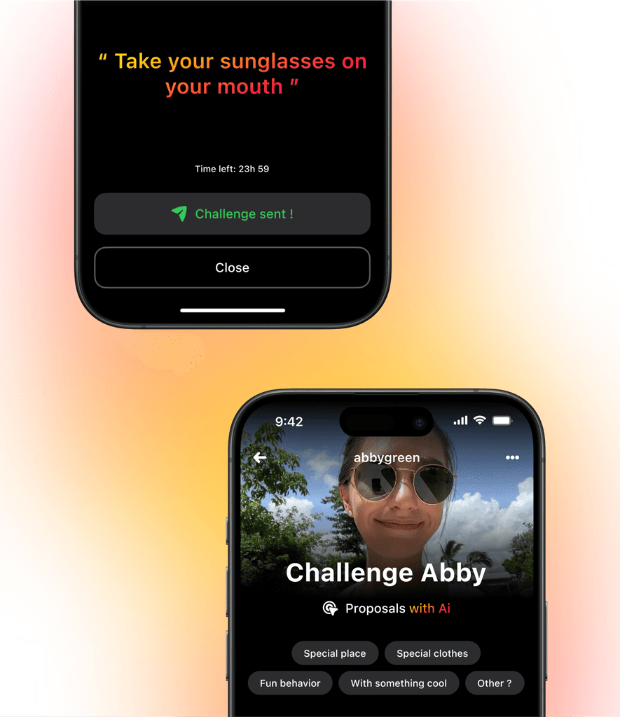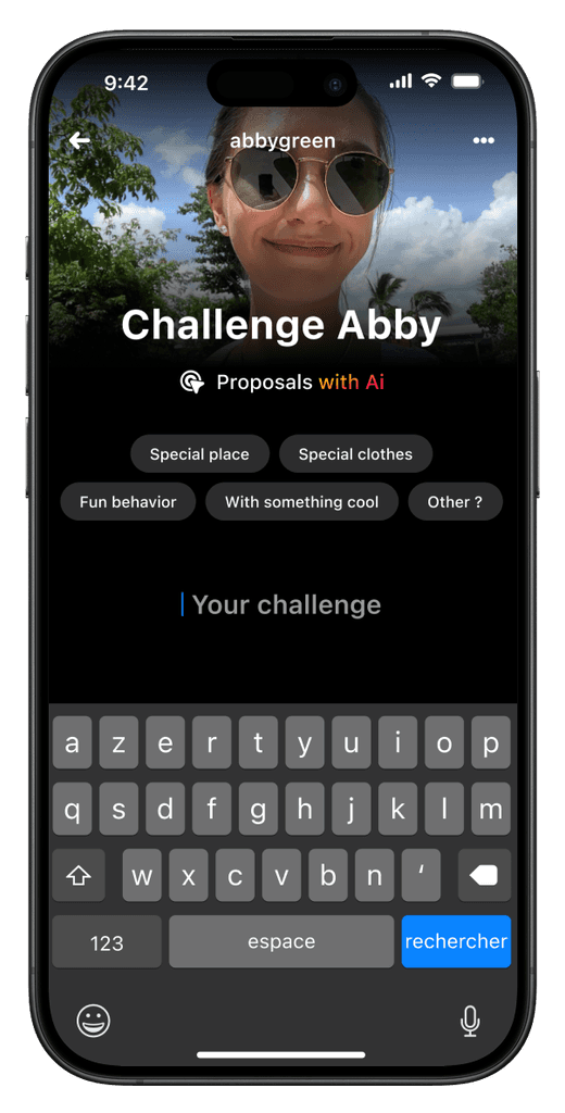 Comment le faire mieux qu’en leur permettant d’agir sur la vie de leur amis et donc prendre aussi le pouvoir de leur usage de l’app. Deux possibilités, lancer un défi à un ami à n’importe quel moment, qui expire sous 24h, avec le sujet et le défi de son choix.
